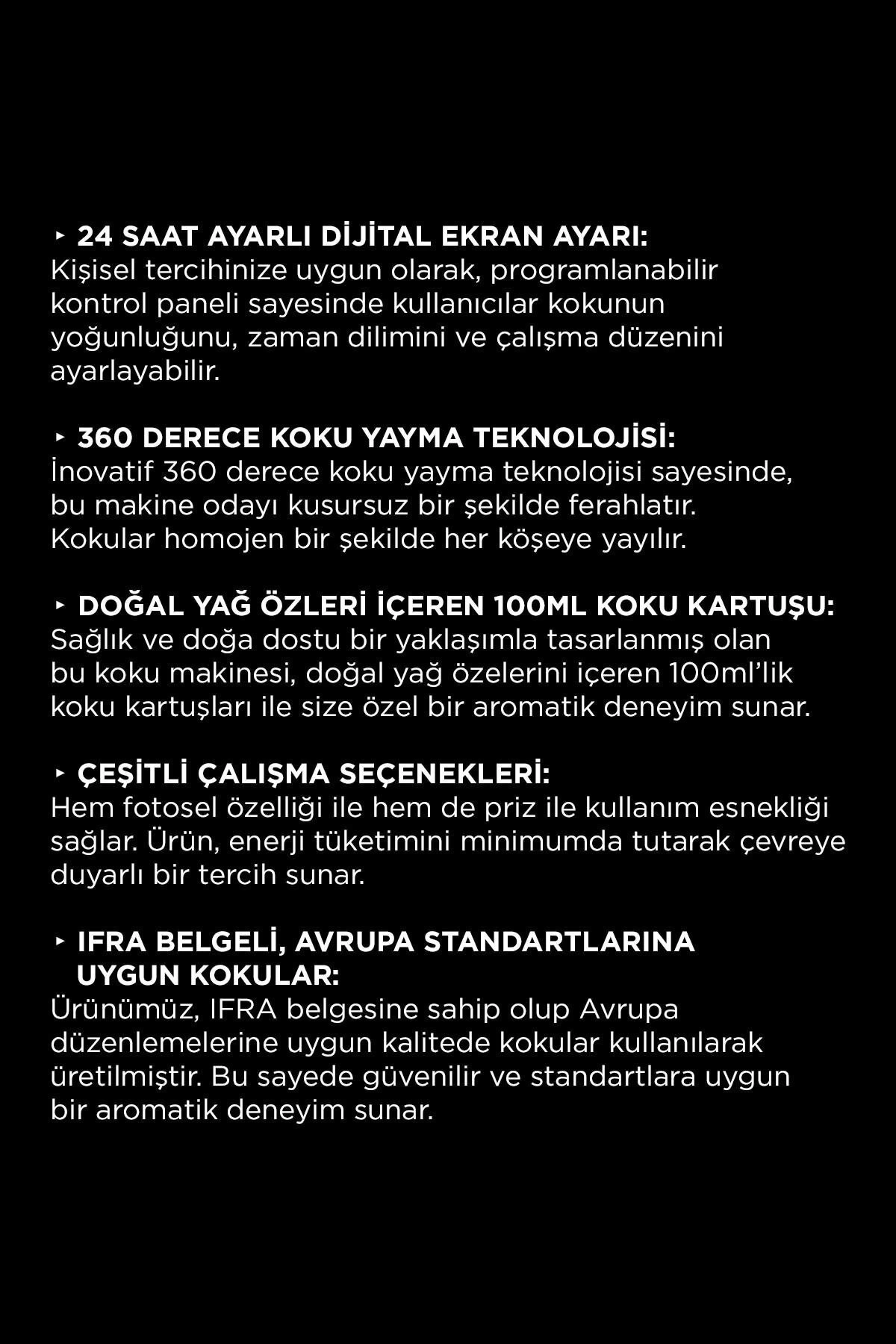 - Programlanabilir kontrol paneli sayesinde kullanıcılar kokunun yoğunluğunu, zaman dilimini ve çalışma düzenini ayarlayabilirler.